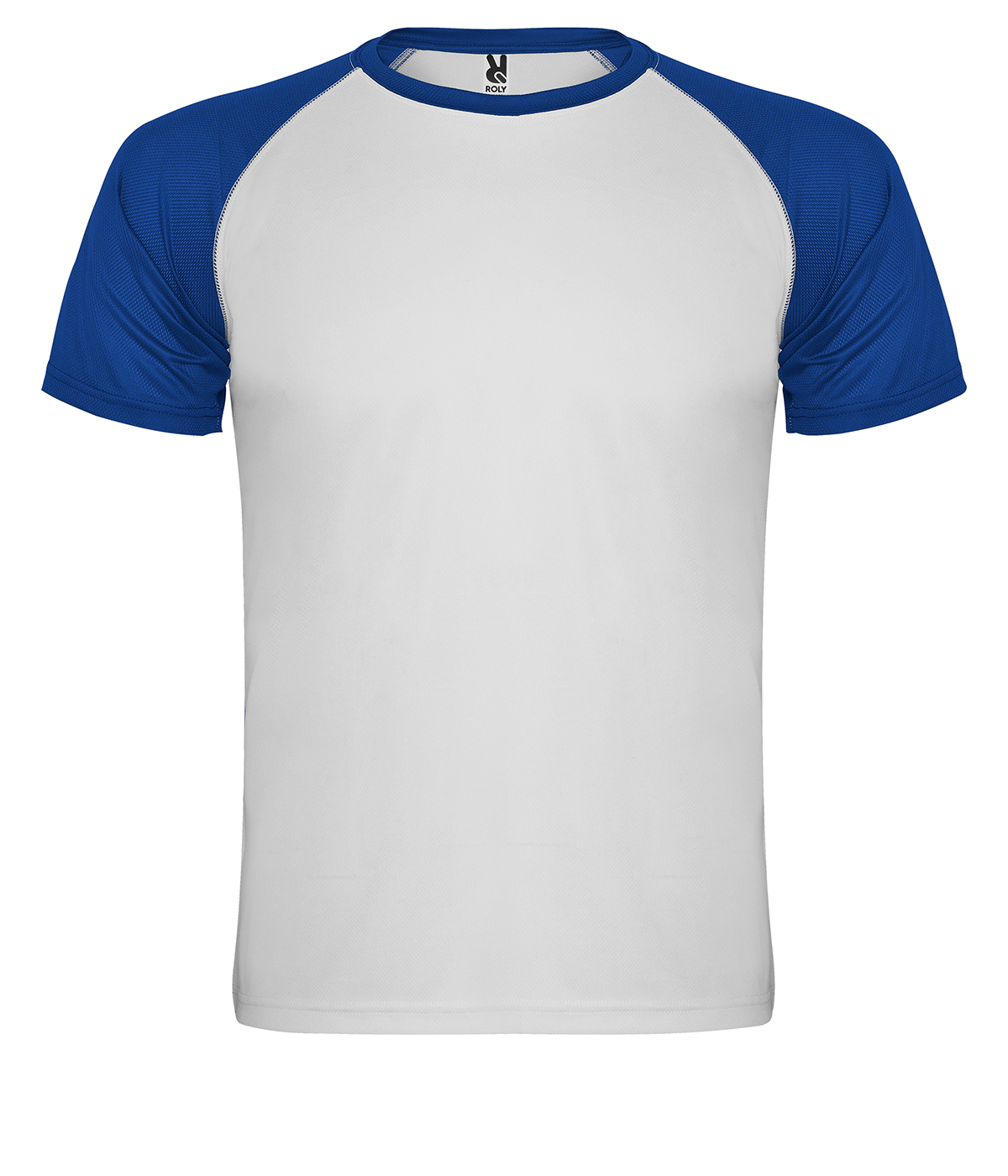 Camiseta deportiva de manga corta estilo ranglan en contraste. Cuello redondo en contraste con cubrecosturas de refuerzo en su interior.